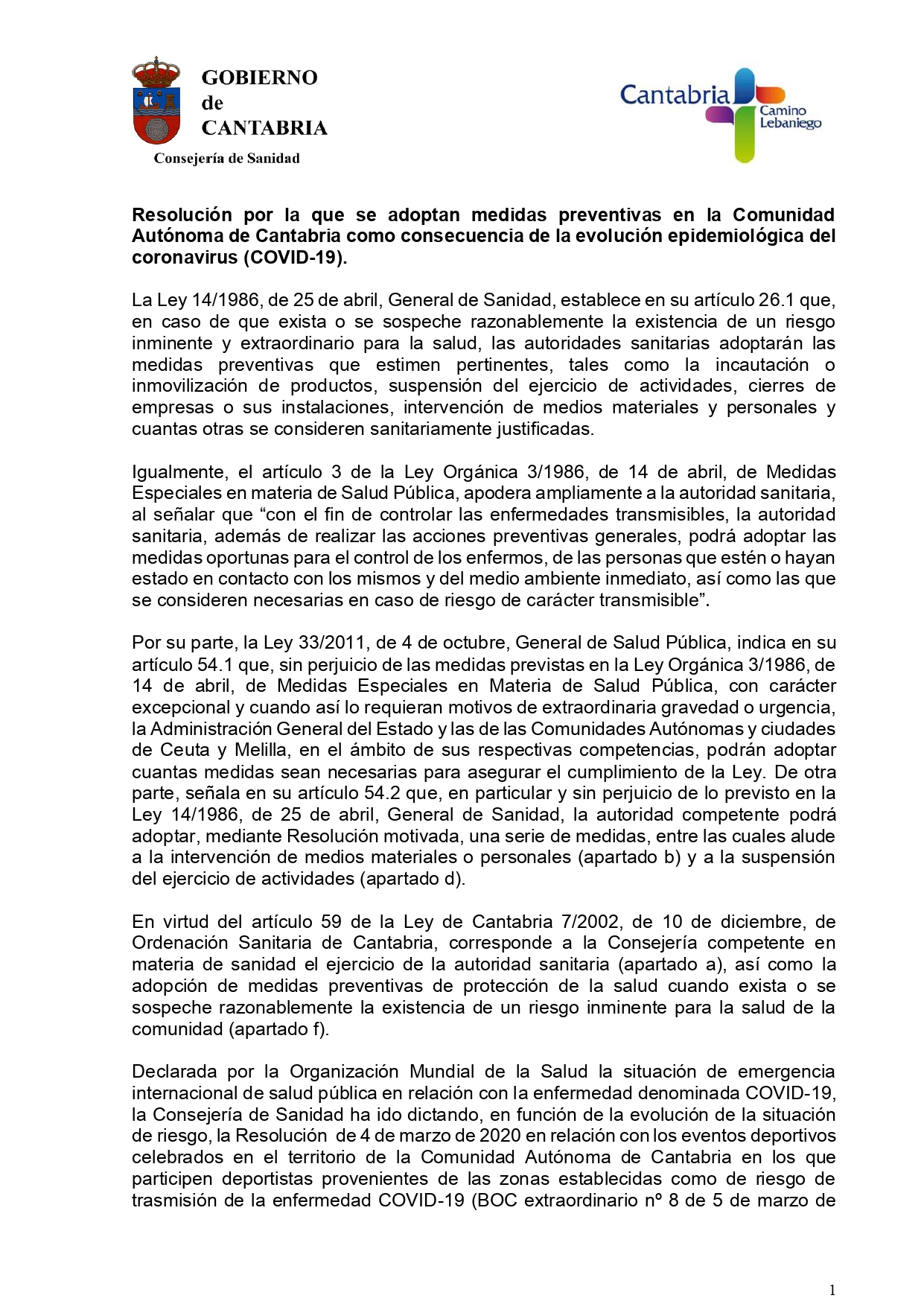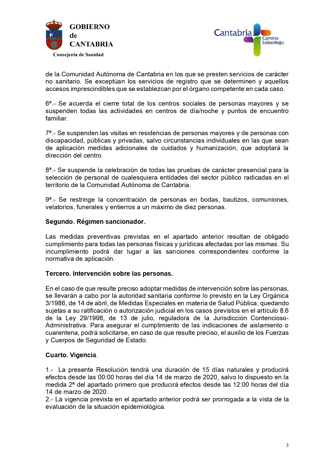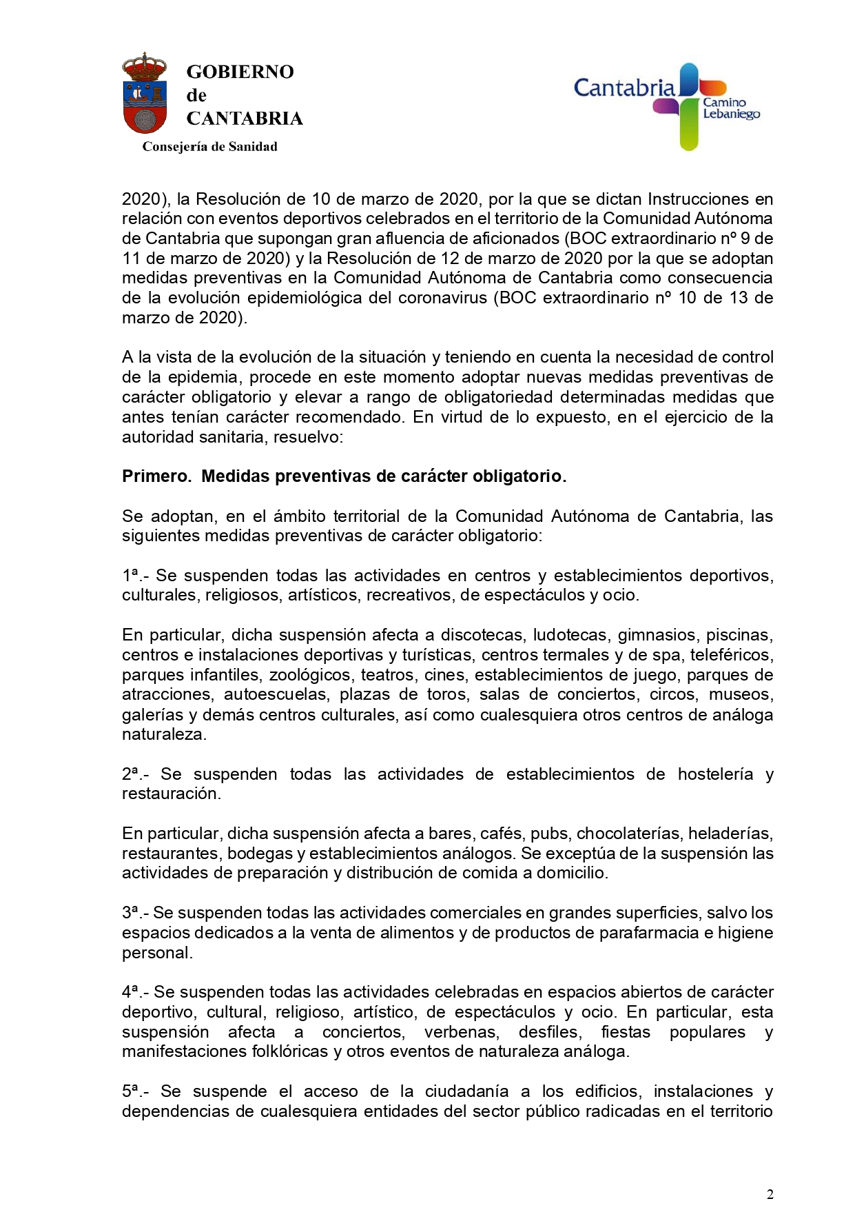 Ante la existencia de un riesgo ‘inminente y extraordinario’ para la salud a causa del coronavirus COVID-19, el gobierno de Cantabria a través de la consejería de Sanidad ha ordenado el cierre de los negocios de hostelería desde las 12.00 horas de este sábado y también desde esta medianoche quedará suspendida la actividad comercial en grandes superficies (salvo la venta de alimentos y de artículos de higiene y parafarmacia) así como el acceso a edificios públicos no sanitarios.