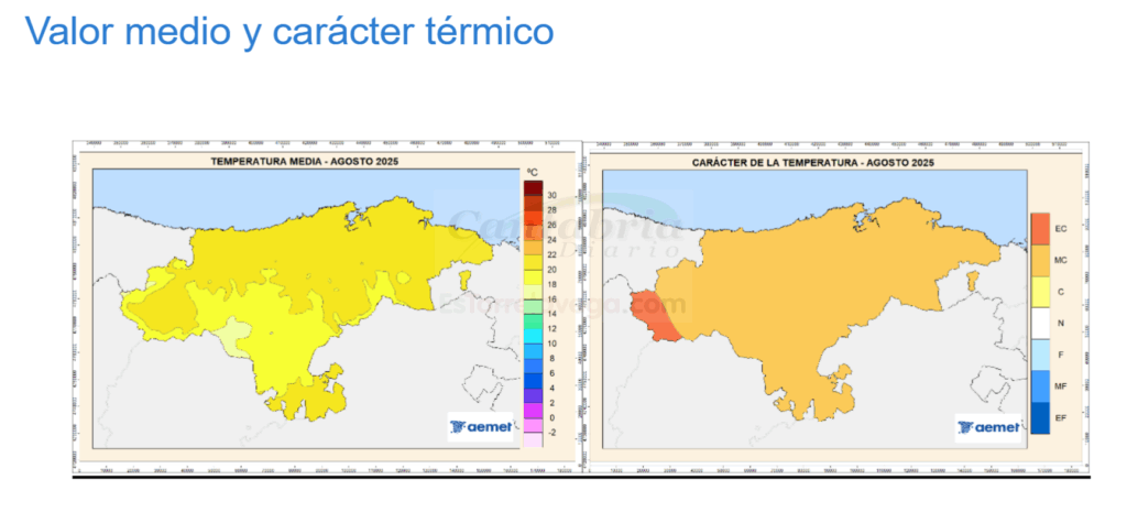 El Resumen Climatológico Mensual elaborado por la Agencia Estatal de Meteorología en Cantabria refleja que el mes de agosto fue muy cálido y pluviométricamente normal. Agosto resultó un mes muy cálido, con 19,9 ºC de temperatura media registrada en la región. Esta cifra se encuentra 1,6 ºC por encima del promedio para este mes de la serie de datos de referencia 1991-2020 que es de 18,3 ºC. Este mes se sitúa como el tercer mes de agosto más cálido del periodo 1961-2025.