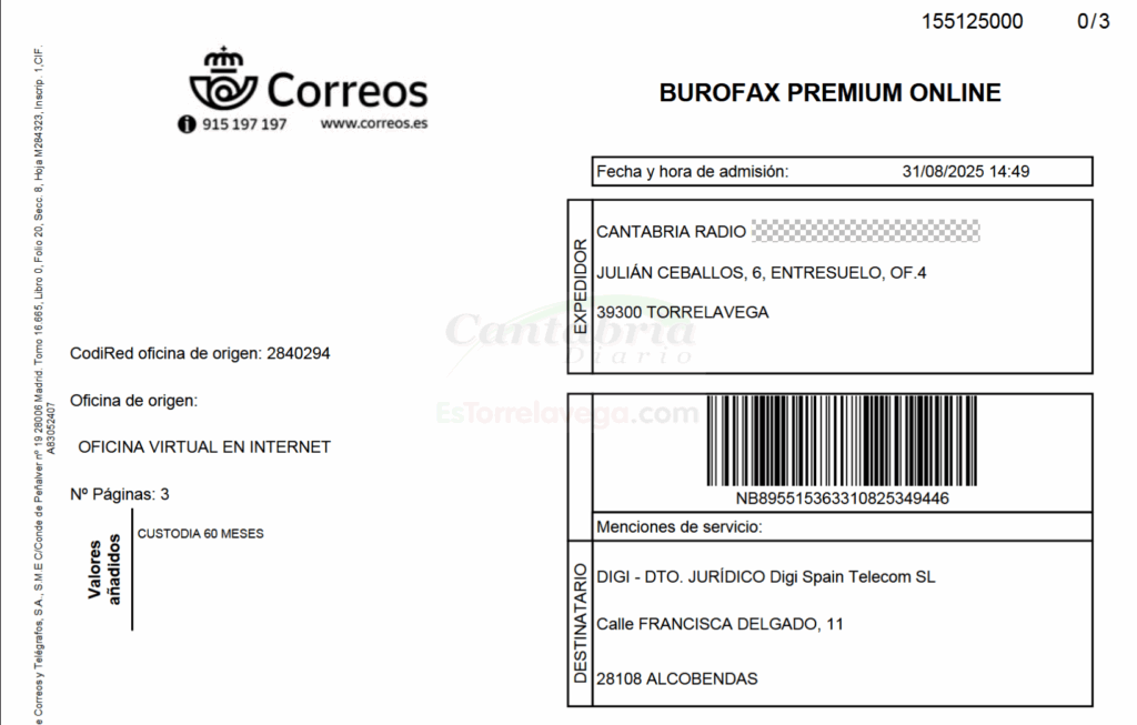 CANTABRIA RADIO envía un burofax a DIGI para exigir el desbloqueo inmediato de su legítimo Medio de Comunicación, censurado a instancias de LALIGA