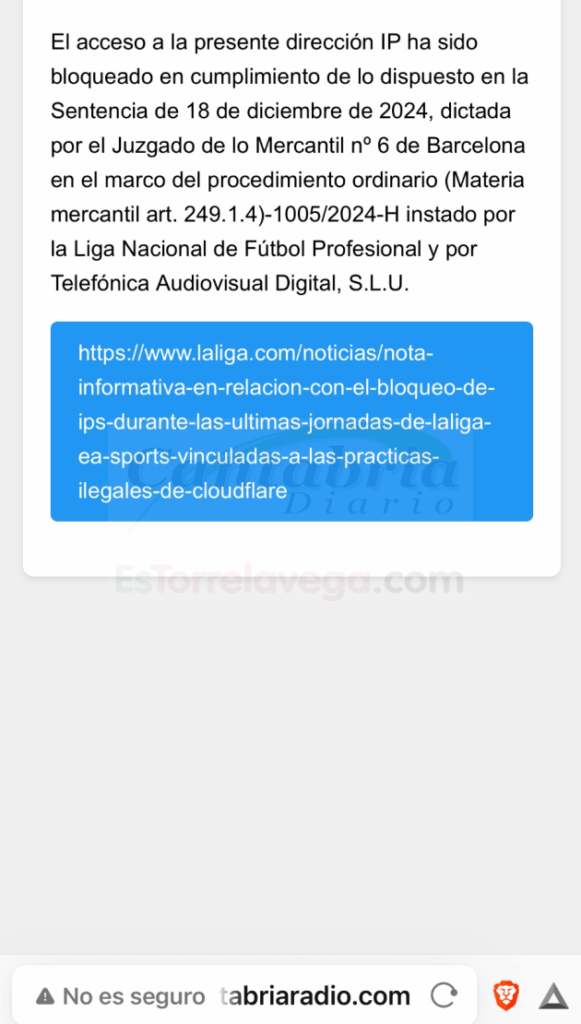 Esto genera que cada vez que hay fútbol de LALIGA miles de páginas web españolas legítimas dejan de funcionar, desde páginas institucionales hasta Medios de Comunicación como CANTABRIA RADIO, farmacias, repositorios de software fundamentales para el buen funcionamiento de Internet, plataformas digitales y miles de pequeños y medianos negocios legítimos que tienen todo el derecho del mundo a seleccionar los servicios de empresas legales como CloudFlare, o cualquier otra empresa legítima en virtud de la Libertad de Empresa. Nuestra radio CANTABRIA RADIO ha sufrido los bloqueos más recientes, estando inaccesible durante las horas de los partidos de LALIGA.
