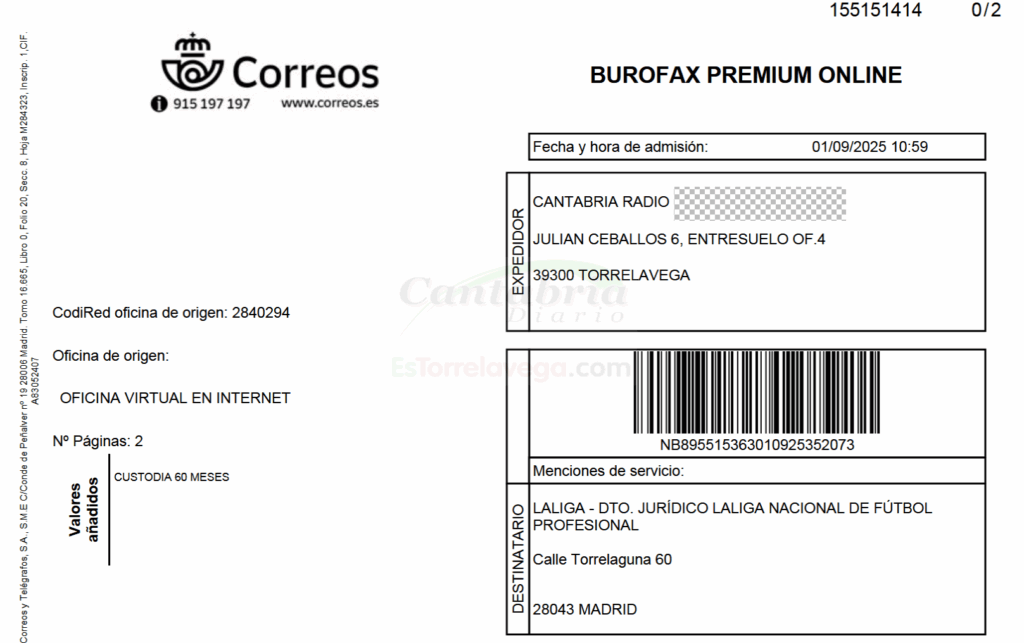 CANTABRIA RADIO envía un burofax a LALIGA para exigir el desbloqueo inmediato de su legítimo Medio de Comunicación