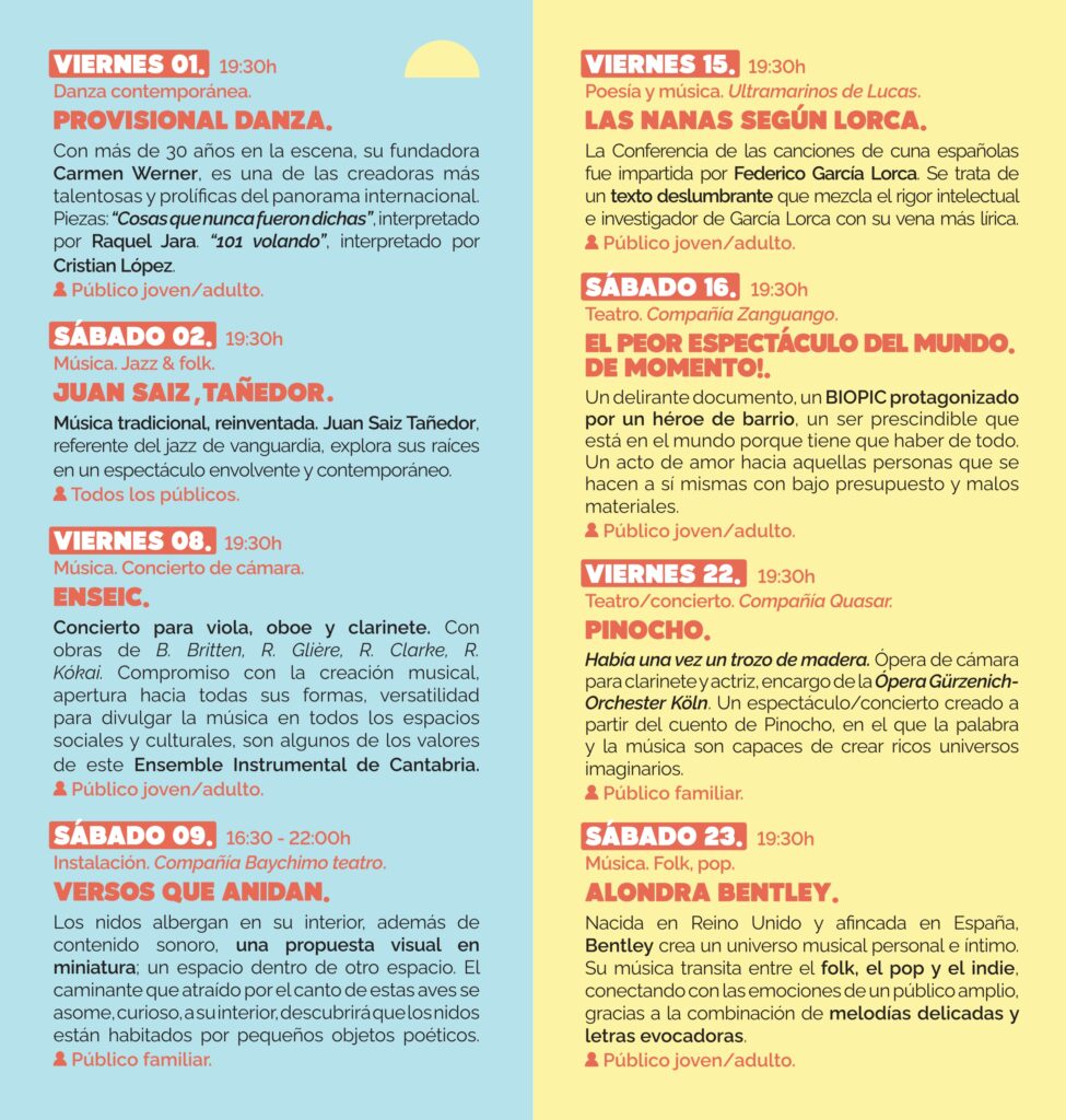 La propuesta, coordinada y diseñada en esta primera edición por Mónica González Megoya (Quasar Teatro) nace con vocación de continuidad y con la aspiración de consolidarse como un referente de los veranos santanderinos.