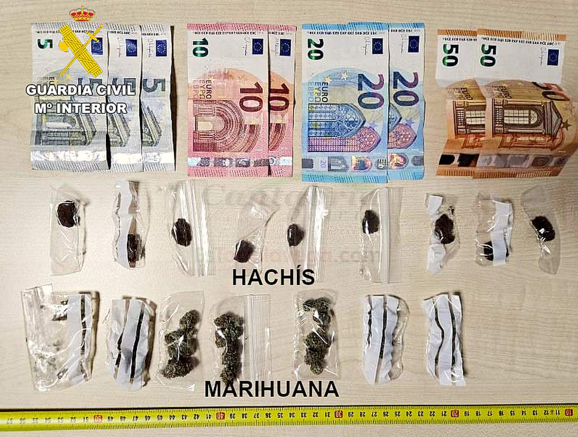 La Guardia Civil intervino 16 envoltorios con diferentes cantidades de hachís y marihuana, así como dinero de posibles ventas.