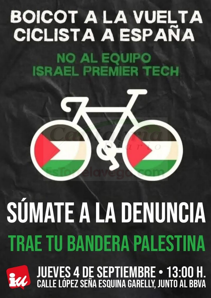 Izquierda Unida de Laredo se ha unido a la campaña nacional de rechazo a la participación del equipo de Israel en la Vuelta Ciclista a España convocando a los vecinos de Laredo a acudir con sus banderas palestinas a la salida de la duodécima etapa que tendrá lugar el próximo jueves 4 de septiembre.