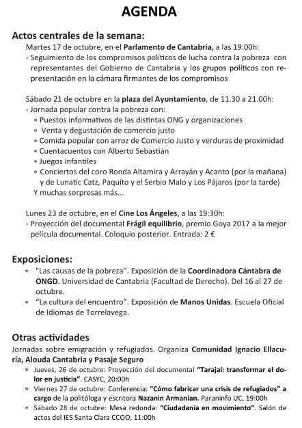 El martes 17 de octubre a las 19.00 h., coincidiendo con el Día Mundial Contra la Pobreza, el Parlamento de Cantabria acogerá un encuentro entre la Alianza y los grupos políticos con representación en la cámara, para dar seguimiento a los compromisos de lucha contra la pobreza adquiridos por las fuerzas políticas territoriales durante la campaña electoral de 2015. La Alianza abre esta cita a la ciudadanía y anima a participar en la misma a las personas y organizaciones sociales que lo deseen. El acto terminará con la lectura de un manifiesto.