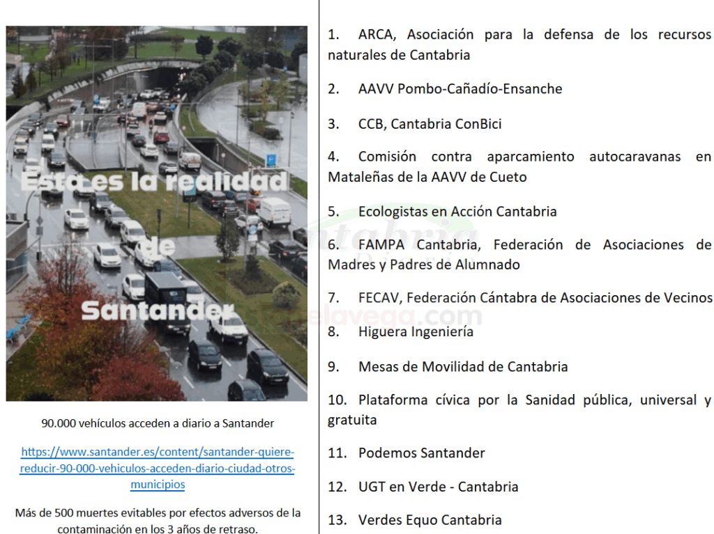 Bajo el lema “NO a una ZBE fraude”, la Asamblea denuncia que la delimitación propuesta ‘afecta únicamente al Ensanche, lo que supone tan solo el 0,6 % de la superficie de la ciudad, dejando fuera las calles más contaminadas de Santander como Castilla-Hermida, Plaza de Las Estaciones, Valdecilla, Cuatro Caminos, Calle Alta o San Fernando’.