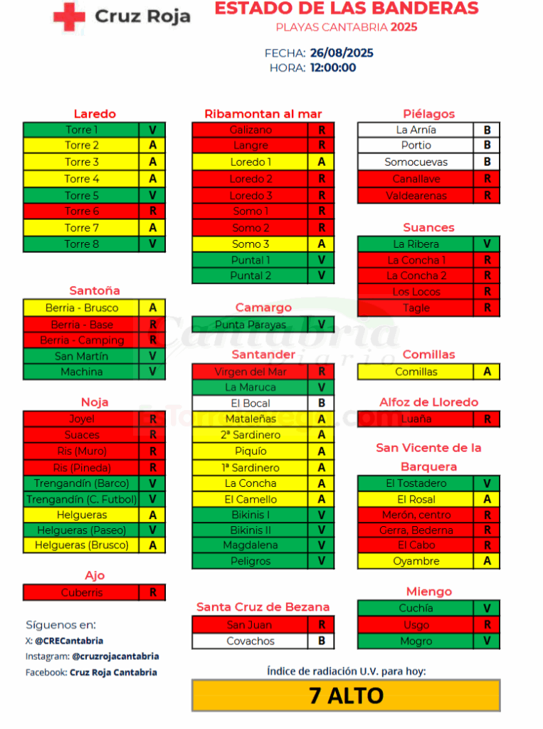 El informe de playas elaborado por Cruz Roja Cantabria refleja para este martes 26 de agosto que muchas de las playas tienen bandera roja, que prohíbe el baño, o bandera amarilla que permite el baño con precaución.