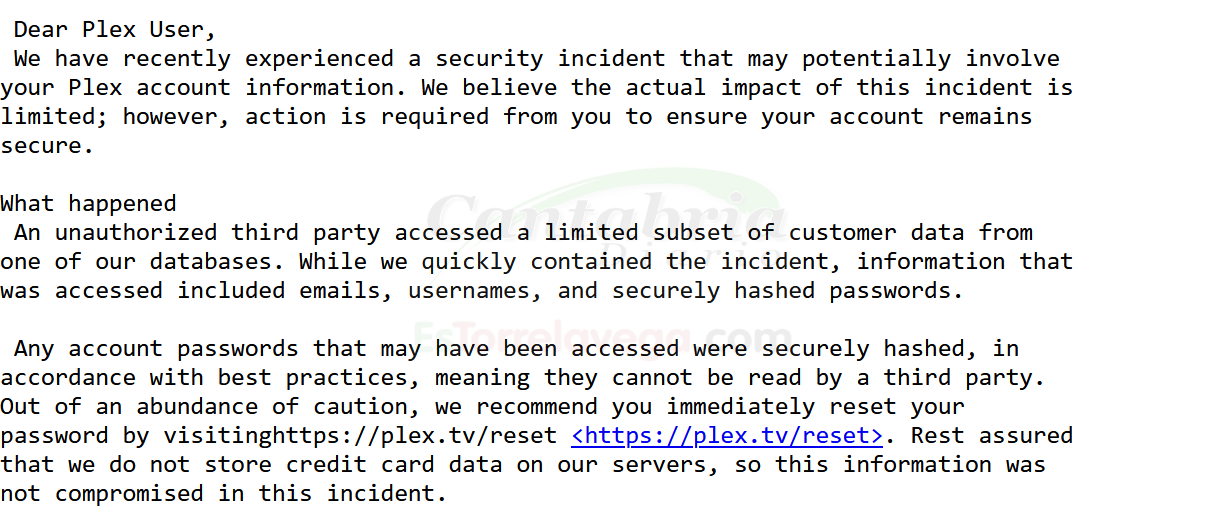 «Por precaución, le recomendamos que restablezca su contraseña inmediatamente visitando https://plex.tv/reset <https://plex.tv/reset>. Tenga la seguridad de que no almacenamos datos de tarjetas de crédito en nuestros servidores, por lo que esta información no se vio comprometida en este incidente», añade la empresa.