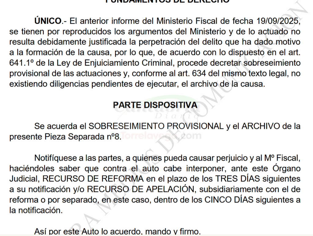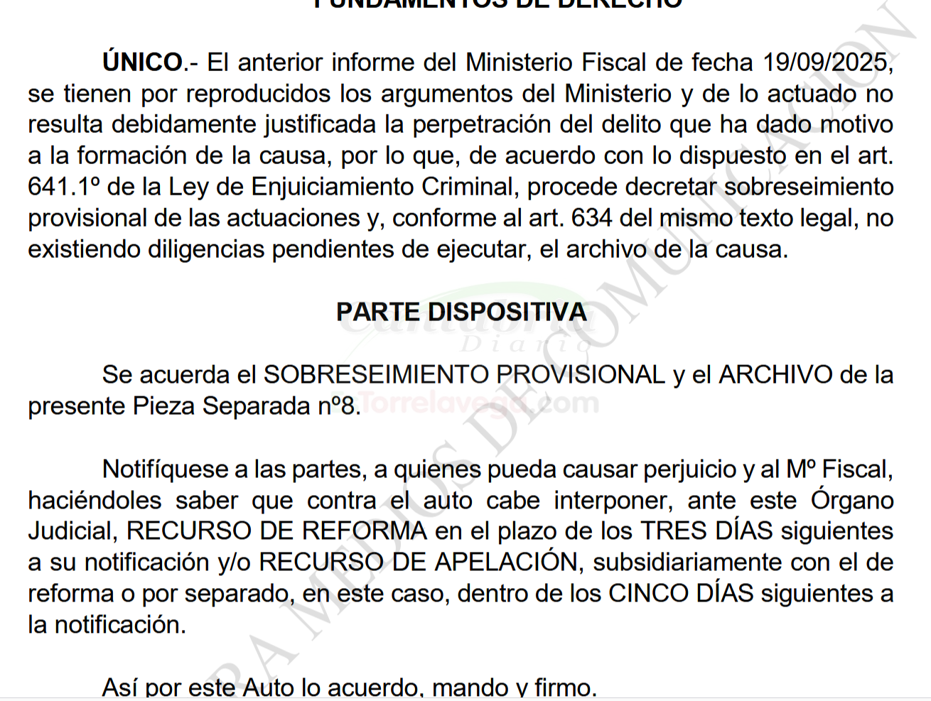 Este señala en su resolución que “de lo actuado no resuelta debidamente justificada la perpetración del delito que ha dado motivo a la formación de la causa”, por lo que “procede decretar el sobreseimiento provisional de las actuaciones”, que corresponden a la denominada Pieza Separada n.º 8.
