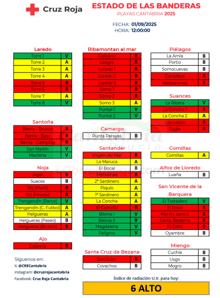 Este día 1 de septiembre se estrena en Cantabria plagado de banderas rojas en las playas, según recoge el informe de Cruz Roja de las 12.00 horas.
