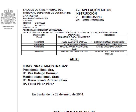 En un auto notificado hoy, la Sala de apelación rechaza cada uno de los argumentos esgrimidos en los tres recursos de apelación y señala que el auto recurrido «cumple las exigencias de motivación y de contenido, dado que determina los hechos punibles y además identifica a los acusados».