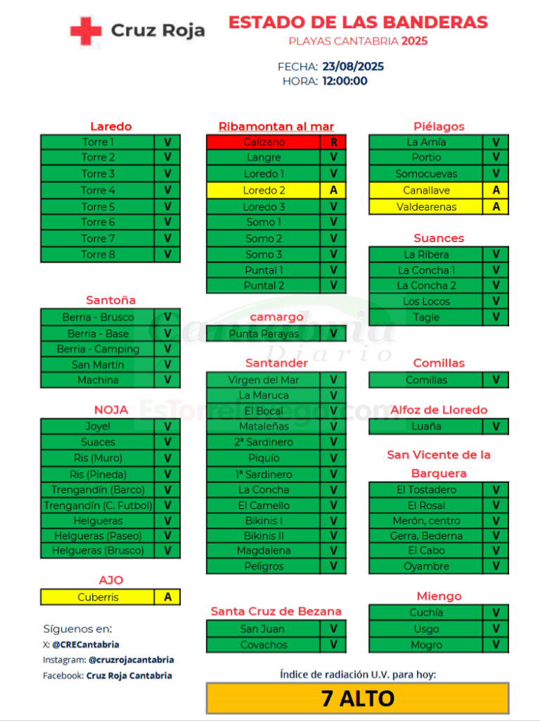 El resto de playas de Cantabria presentan bandera amarilla, en la que se aconseja el baño con precaución, y bandera verde con baño libre.