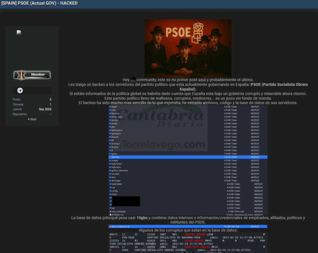 Según la publicación en el foro, los datos obtenidos incluirían datos de la intranet, credenciales e información personal de los empleados, información sobre afiliaciones políticas y datos de políticos y miembros del partido, como el presunto «corrupto», afirma el «hacker» Santos Cerdán, Koldo García y José Luis Ábalos.